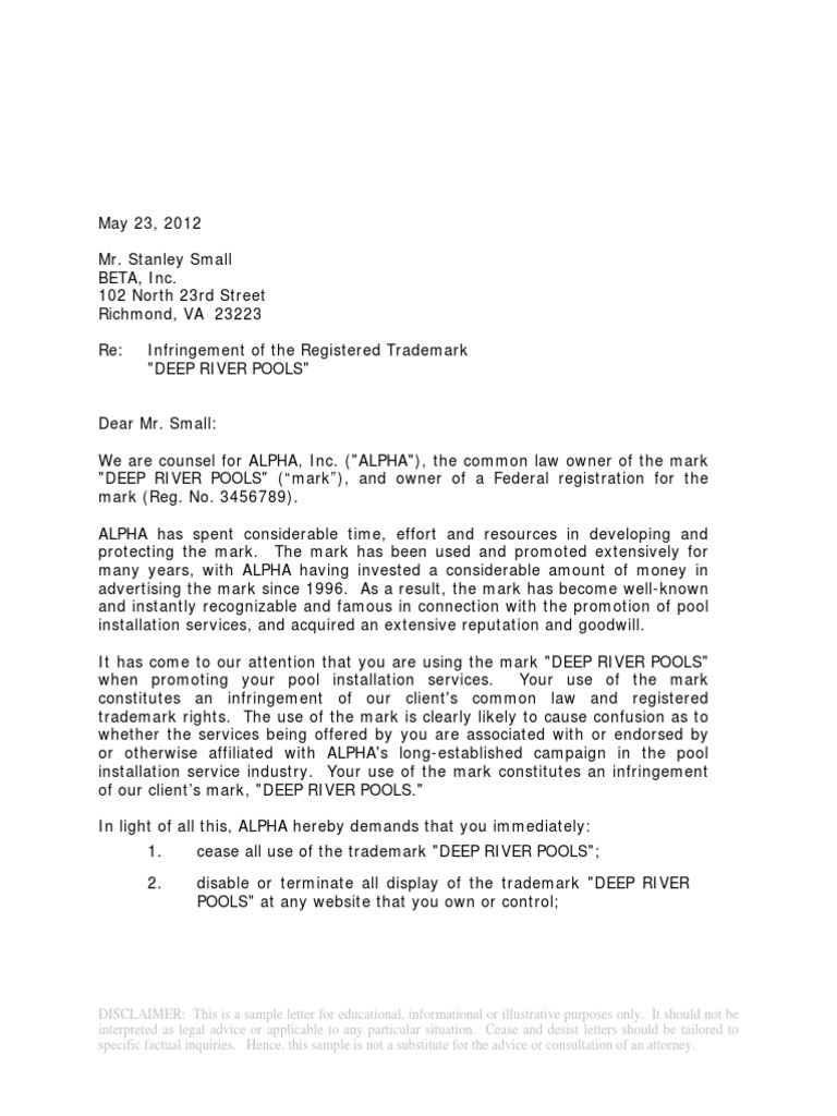 Cease And Desist Letter Trademark Sample. A cease and desist letter is sent to immediately stop an individual or entity from continuing a specified action. The purpose of the letter is to threaten Cease and desist letters are sent when someone wants another party to cease their illegal activity without having to escalate the situation by bringing.