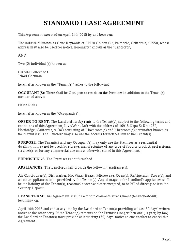 California Standard Lease Agreement Residential 2016-10-14 ...