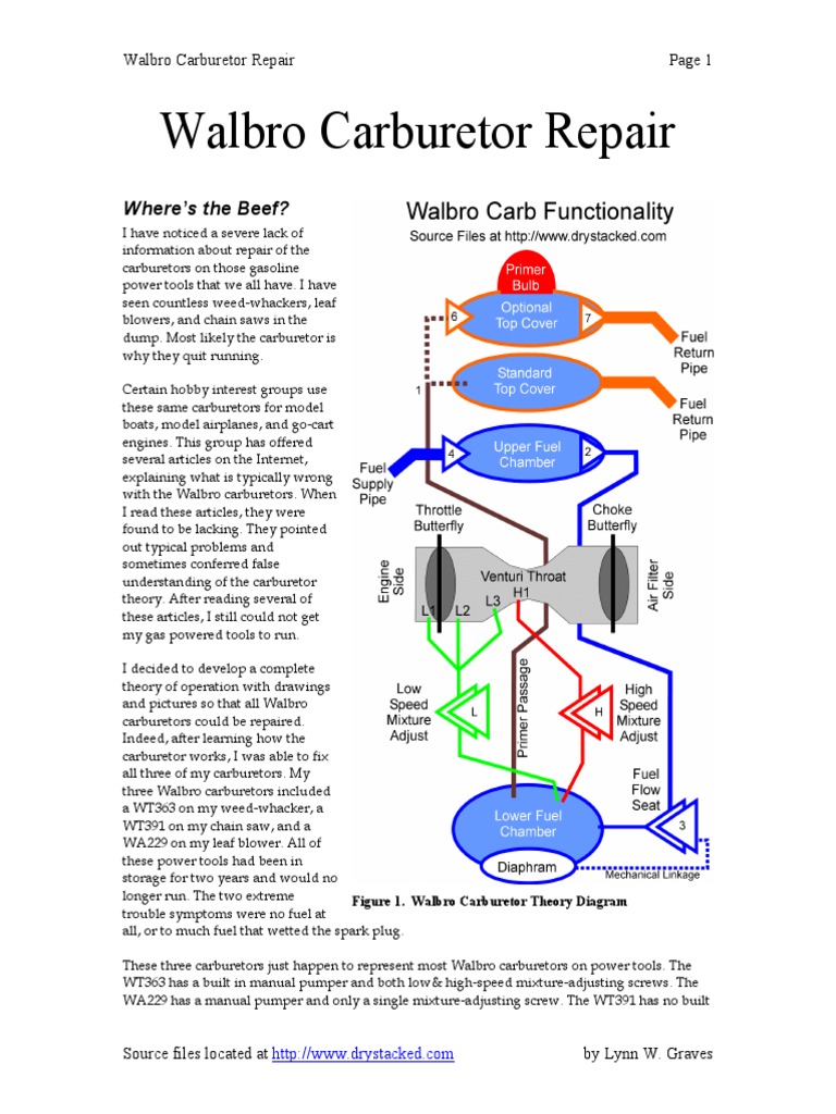 New, Bulk Packed. diverse as the Walbro diaphragm carburetor line has become, producing a manual to detail the repair of each Instead, what we hope to do here is to show you the individual components that are found in various combina- tions within our carburetors and show you how to troubleshoot and service them..